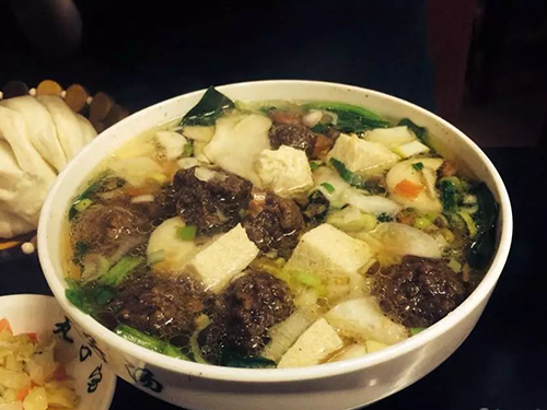 又叫三鮮丸子湯。丸子湯的湯可是很講究的,要把牛肉的牛骨頭一起熬制很久才能出來(lái)如此美味的高湯。 丸子湯一上來(lái),先喝一口湯,讓整個(gè)身體都熱火起來(lái),口口都透著鮮啊;做丸子也得是絕活,用新鮮牛肉入料,炸熟燉到湯里,外脆里嫩的,口口都透著香啊;再吃塊凍豆腐,豆腐里吸足了湯,吃下去真是回味悠...