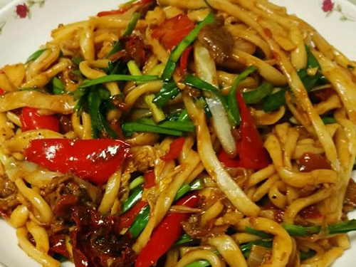 材料:拉面、羊肉、洋蔥、青椒(或蒜臺(tái))、蕃茄醬、干紅辣椒(不吃辣的可以省去)、蒜末。