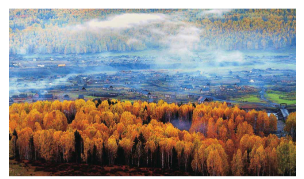 白樺、村莊、迷人的光影是禾木最經(jīng)典的畫面,幾條不同色帶之間層次分明,富有形式感,上面的云霧恰到好處,渲染了這種童話世界般的純凈。