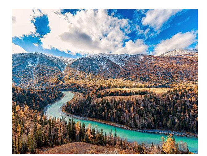 喀納斯湖水變換著各種美妙的顏色,寶石般的湖藍(lán)色,亦或是金黃色、淡綠色、銀白色、橙紅色,什么顏色照到了這面鏡子里,它就變化成什么顏色。秋天的色彩更是豐富,白樺林銀白的樹干、金黃的葉子,其中夾雜著翠綠的松柏,天空是湛藍(lán)湛藍(lán)的。
