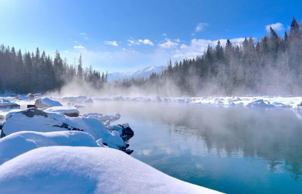 冬日禾木展現(xiàn)出另一番美景,豎線條的樹干讓畫面看上去更加整齊、規(guī)整,而即使都是白色的雪,之間也因為光影的不同而具有色彩、明暗的變化。