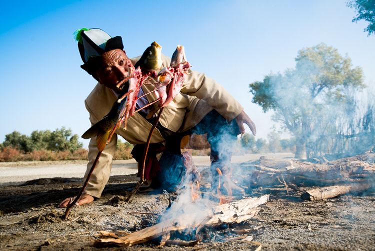 羅布人與荒原為伴,生活習(xí)俗也充滿了荒原的特征,粗獷、原始、具有非凡的忍耐力和適應(yīng)性。羅布人的飲食主要以烤魚為主,羅布人圍火堆烤魚已經(jīng)成為其一大特色。羅布人的薩特瑪(房屋)古樸隨意,建筑獨(dú)特,通常在海子(湖)邊找一棵大的胡楊樹,以樹冠為屋頂,集紅柳、蘆葦、樹條編插成一棚茅屋。羅布人出行不騎馬和駱駝堪稱一絕,僅憑一葉羅布舟(維吾爾語(yǔ)“卡盆”,獨(dú)木舟的意思)便可在海子連片的村寨間穿梭自如。