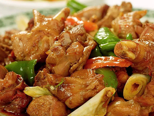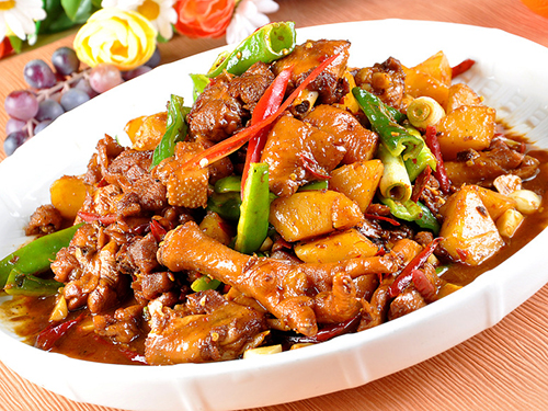 新疆大盤雞是新疆地區(qū)名菜,大約起源于80年代后期,主要用料為雞塊和土豆塊,配皮帶面烹飪而成。新疆大盤雞色彩鮮艷,有爽滑麻辣的雞肉和軟糯甜潤的土豆,辣中有香,粗中帶細(xì),而且經(jīng)濟實惠,親朋聚會食用尚家。