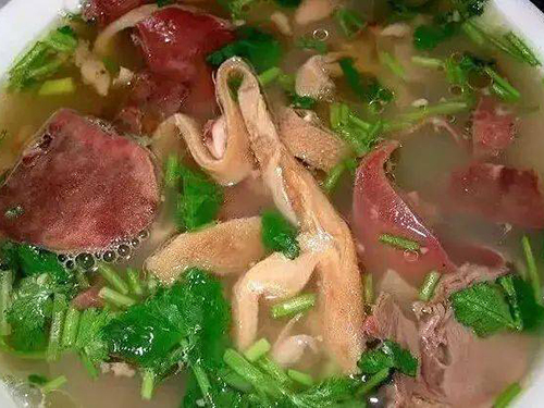 青海人民把雜碎湯泡饃看成是最美好的早餐。它既能補(bǔ)身、耐饑,又能抗寒。雜碎是指煮熟的牛羊的頭、心、肺、腸、胃、四蹄等,俗稱(chēng)“下水”。它又分兩種,即“牛下水”或“牛肉雜碎”、“羊下水”或“羊肉雜碎”。雜碎湯就是雜碎煮成的湯,即下水下鍋后,加調(diào)料、山楂等物,文火煮,腸肚爛后撈出,繼續(xù)煮頭蹄,去上層油 凝固(稱(chēng)“化油”),全部撈出備用。湯中加一些干蔥絲、綠芫荽等調(diào)味品。雜碎湯香味濃、不膩、補(bǔ)身。