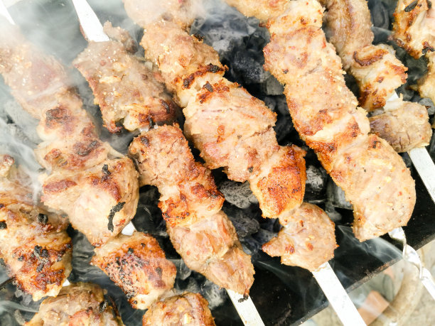 烤羊肉串:把羊肉和羊油切成薄片,肥瘦搭配地穿在細(xì)鐵釬上,放在長(zhǎng)形的烤羊肉串爐上烤,然后撒些辣面、精鹽和孜然粉,數(shù)分鐘即熟。