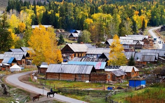 阿爾泰山上密密麻麻的金黃金黃的松樹林一直延伸到白哈巴村里,村民住的木屋和圈養(yǎng)牲畜的柵欄錯落有致地散布在松林和樺林之中,安寧、祥和。