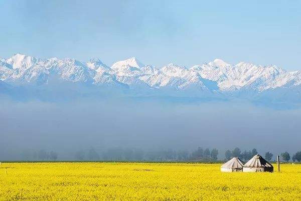 近百萬畝油菜花開遍座座山坡,一條條金色油菜花田,仿佛一條金黃色的毯子一樣鋪滿了這廣袤無垠的昭蘇大草原,白雪皚皚的天山在遠處靜靜地矗立著,像是在守衛(wèi)這一抹人間美色的天神一般,他們遙相輝映,堪稱西部盛景。
