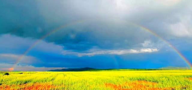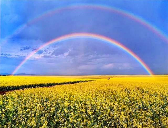 若是提起夏日賞油菜花的最佳去處,昭蘇大概是最著名的。萬畝花海,轟轟烈烈盛開,云霞幻彩下,猶如仙境。大地上是悠然幾筆揮就得明黃花海,天空中彩虹多彩斑斕,雨后的天色朦朧,瑰麗夢幻得超出想象。